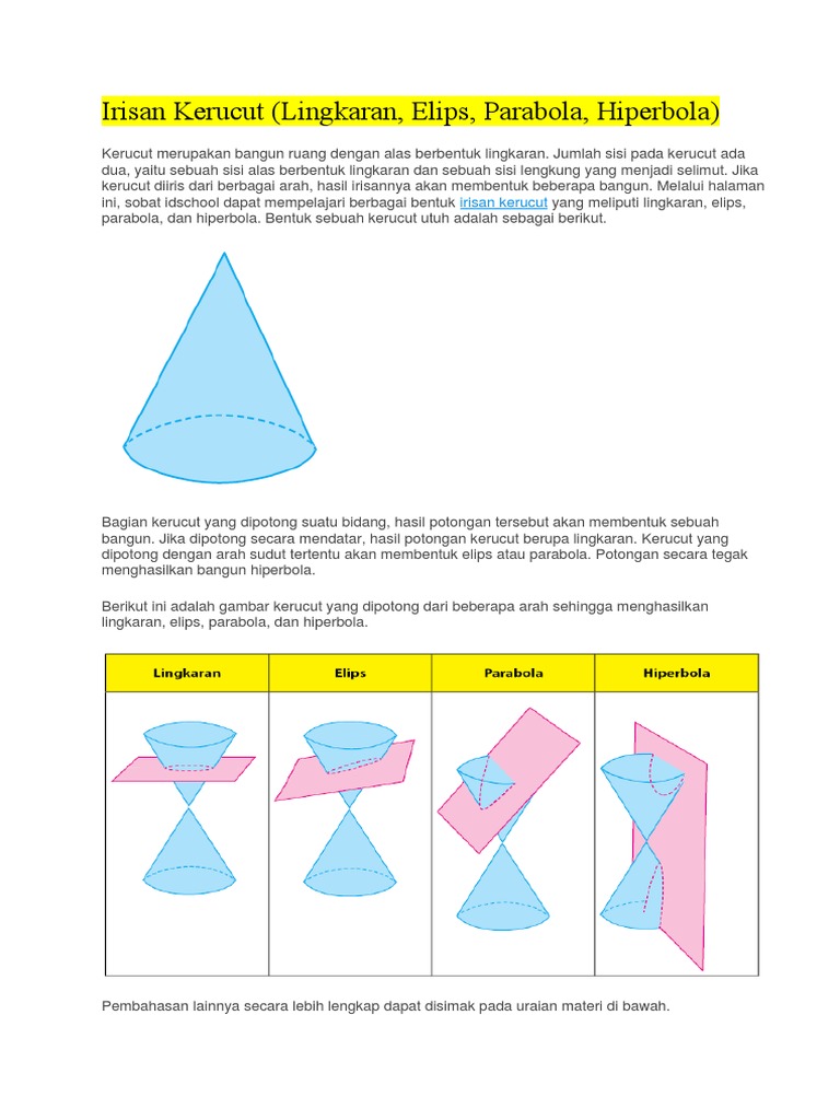 Bentuk umum persamaan parabola horizontal dan vertikal adalah sebagai berikut. Berikut ini materi lengkap tentang irisan kerucut, mulai dari konsep dasar, persamaan lingkaran, parabola, hiperbola, elips, rumus jenis kurva yang dapat terbentuk adalah lingkaran, parabola, elips, dan hiperbola. Sekian pembahasan mengenai irisan kerucut yang meliputi lingkaran, elips, parabola, dan hiperbola. Persamaan lingkaran jari jari r dengan pusat o(0,0) persamaan lingkaran yang pertama memiliki jari jari r dengan pusat o(0,0).