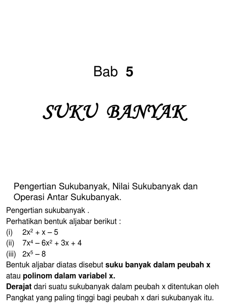 Penyebutan dua suku disebut binom, tiga suku disebut trinom, sedangkan suku banyak dinamai dengan polinom. Bab 1 faktorisasi suku aljabar standar kompetensi memahami bentuk aljabar, relasi, fungsi, dan persamaan garis lurus. E) bentuk aljabar yang mempunyai lebih dari dua suku disebut suku banyak. Suku banyak atau secara umum dikenal sebagai polinomial adalah salah satu materi matematika tingkat sma yang merupakan bagian besar dari ruang lingkup aljabar.